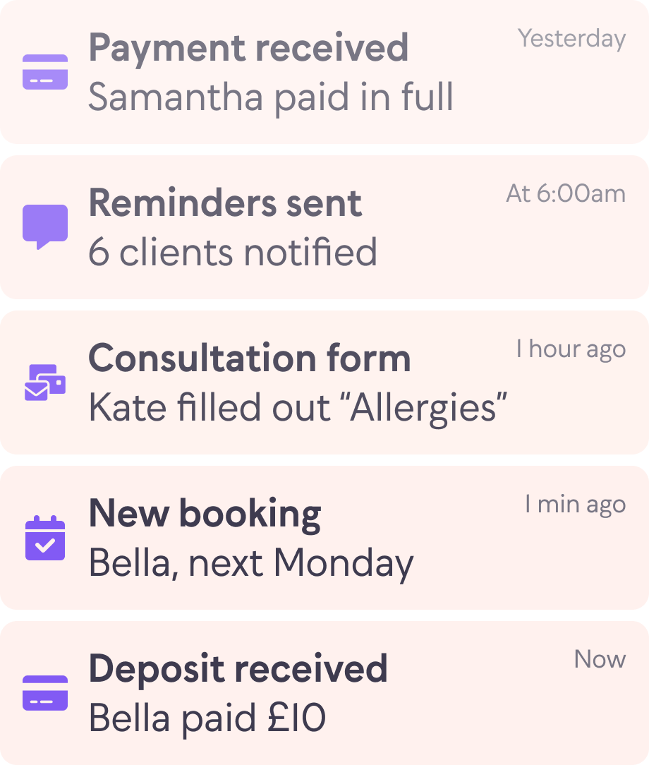 24/7 online booking. Automatic reminders. Clients book themselves while you sleep.